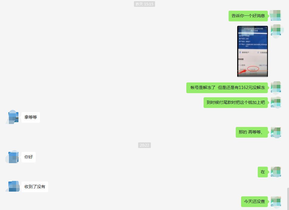 我们马上把这个消息告诉代理,代理让我们再等等,意思是那1162元后续也会解冻,截止到目前为止,还没解冻,最终结果是怎么样的,我们现在还不知道,但是已经很开心了。