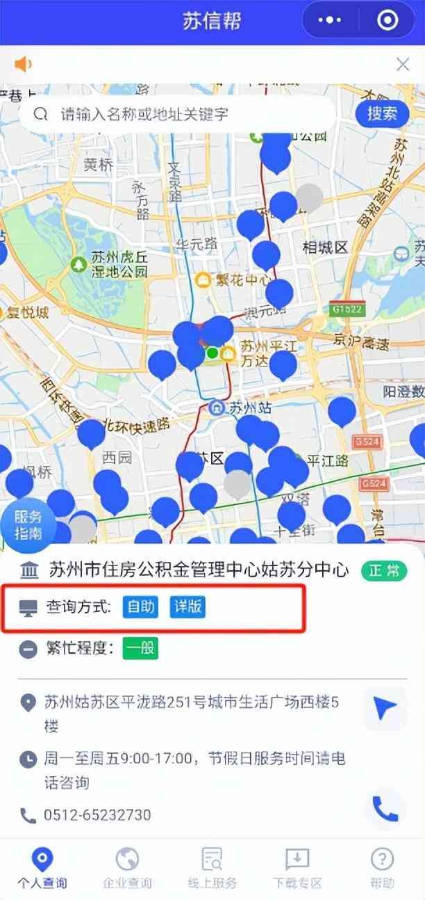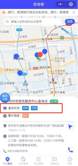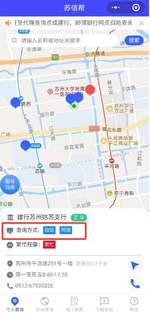 目前人民银行苏州市分行线下网点以及全市55家商业银行代理查询网点设置个人信用报告自助查询柜员机;苏州建设银行、邮政储蓄银行等网点智慧柜员机开设个人信用报告自助查询。如需了解个人信用报告自助机查询网点,您可以通过下方的“苏信帮”小程序查询并定位最近的查询网点地址。