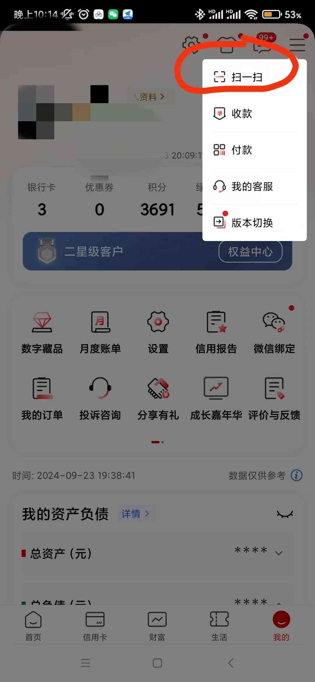 三、用工商银行手机银行APP扫一扫屏幕上的取款码。首先打开手机银行APP并登录,点手机屏幕右上角的“三”图标,接着点“扫一扫”,手机摄像头对准ATM机上的取款码。