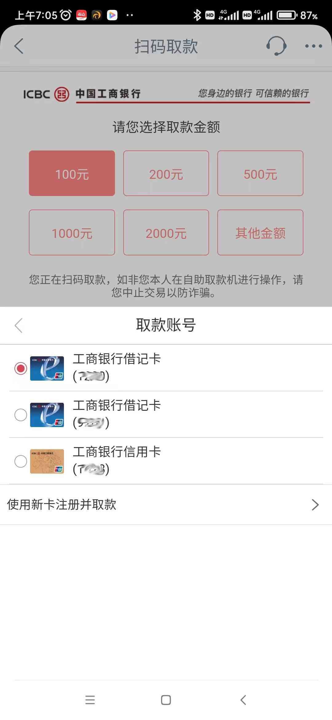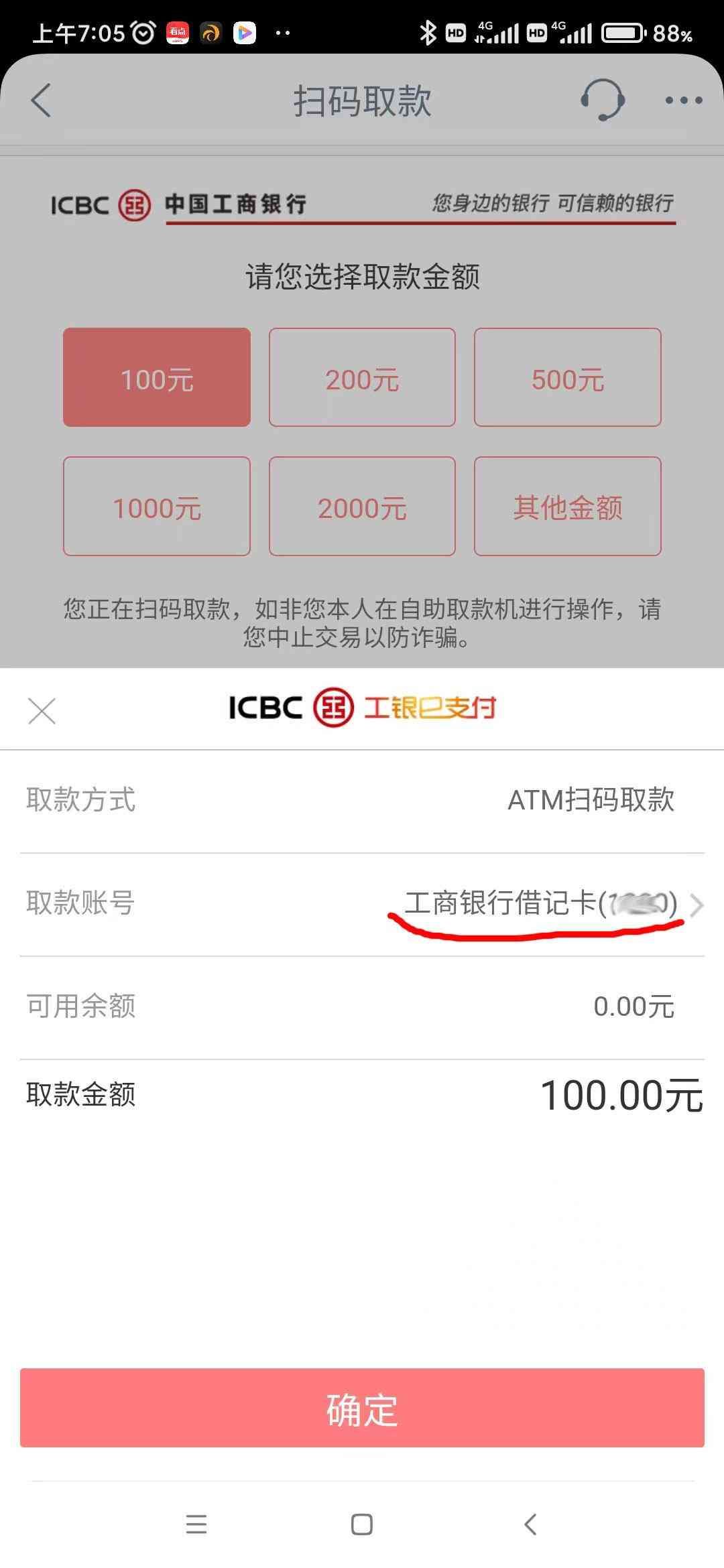 四、在手机上选择取款金额或手动输入其他金额(只支持整百的金额)。看一看取款账号是否为你想要的取款卡号,如果需要更换卡号请选择“取款账号”一行最后面的“>”图标,在新显示的页面上选择新的卡号,点“确定”。