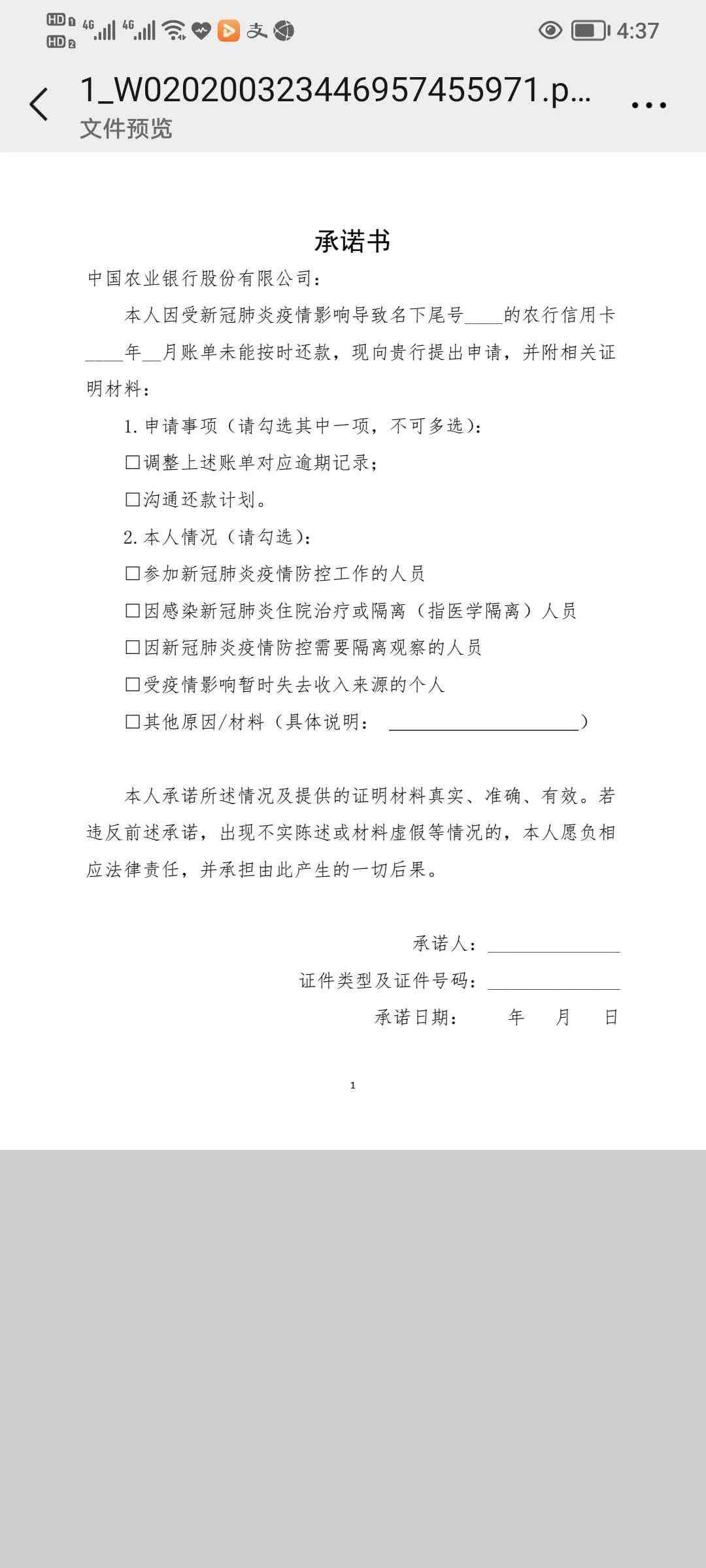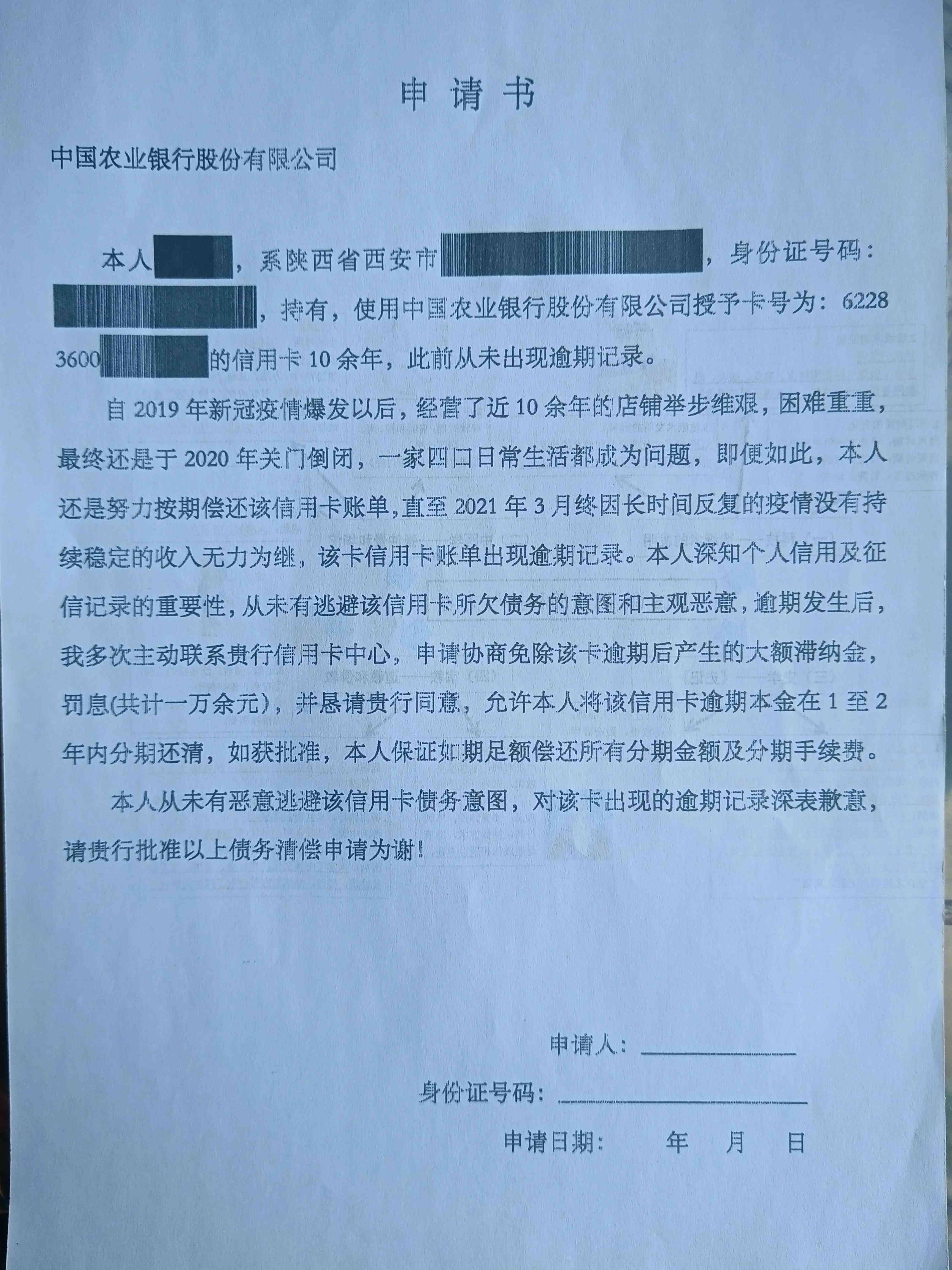 本人的农行信用卡,自去年三月份开始逾期后。有过几次电话催收,邮寄的催收通知书也收了两次,几次主动打电话都协商不成功。一开始客服说是银行没有这政策;后来再打电话又说要到具体的发卡行提交资料申请,于是又跑太白南路的发卡网点,网点又说没政策:只能先全额缴清已产生的滞纳金罚息近万元,本金再申请分1-5年还,滞纳金罚息一分不减免,还必须分期,额外负担外再额外手续费,那还申请个寂寞;没有同意回来又打客服电话申请,客服又说转省分行处理,过若干天有电话说是农行的,询问情况和诉求,完了说要上报省行申请……此后个把月也没消息,没过多久西安疫情爆发,前几天账单日后收到短信提示本息加滞罚已经7万多,心惊肉跳的,想着又得主动打电话了,昨天一早收到农行储蓄卡扣款信息,APP一看才知道街道办刚刚发放到账的2021年冬季取暖补贴5元马上被扣了。今早又打了信用卡中心电话说明情况,客服妹妹很客气,查了之前的申请记录说很感谢主动致电协商,了解诚意,短信发送了“承诺书”的下载链接,嘱咐按要求填写提交资料,等待审核通过……赶紧下载填写发送提交,等待审核……终于不转省行,跑发卡面对面……
