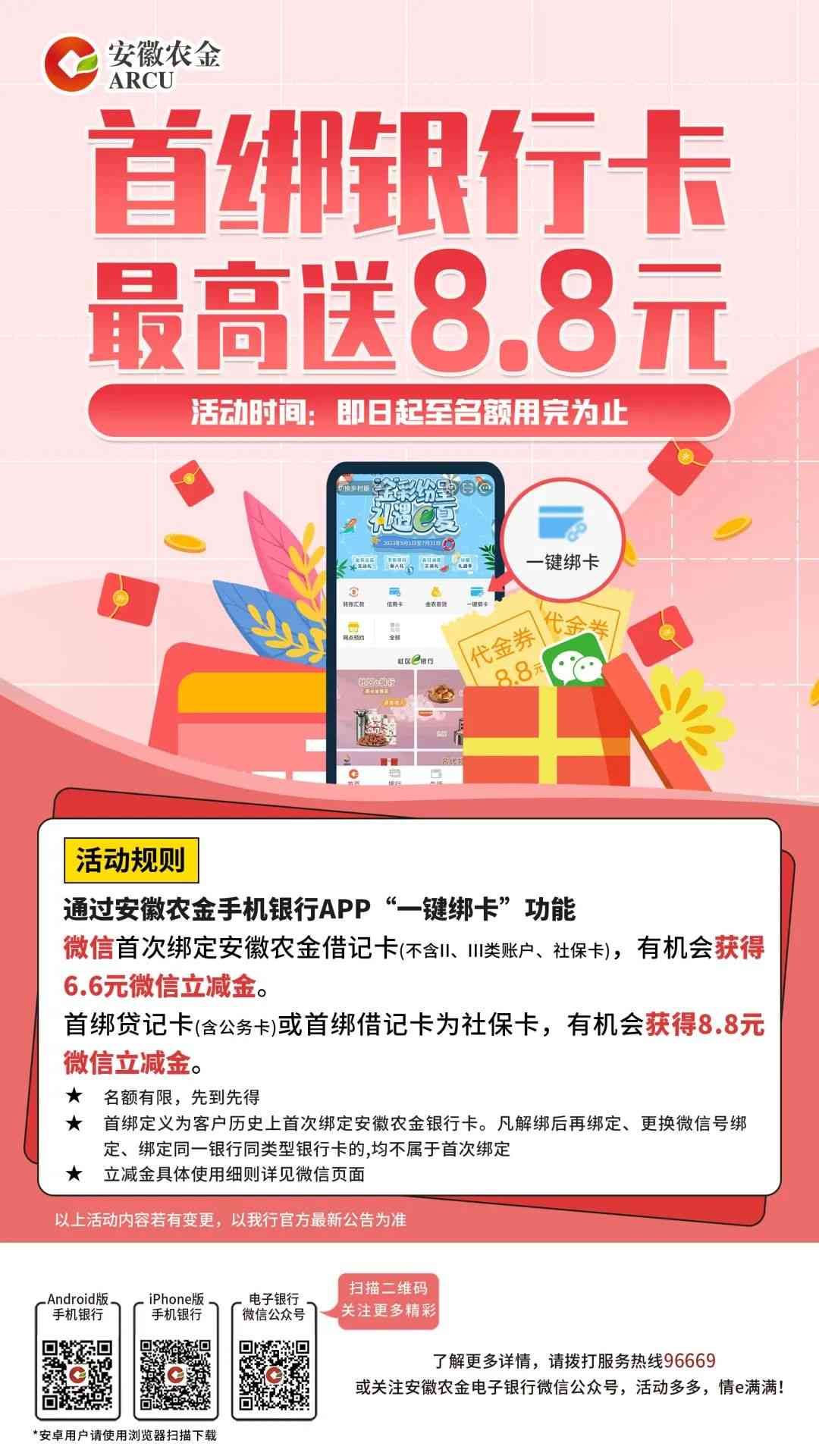 *首绑定义为客户历史上首次绑定安徽农金银行卡。凡解绑后再绑定、更换微信号绑定、绑定同一银行同类型银行卡的,均不属于首次绑定。