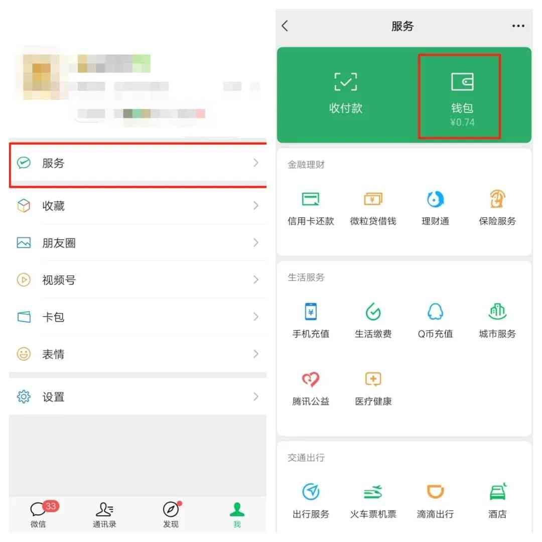 (一)打开微信“我”界面点击“服务”→点开“钱包”。