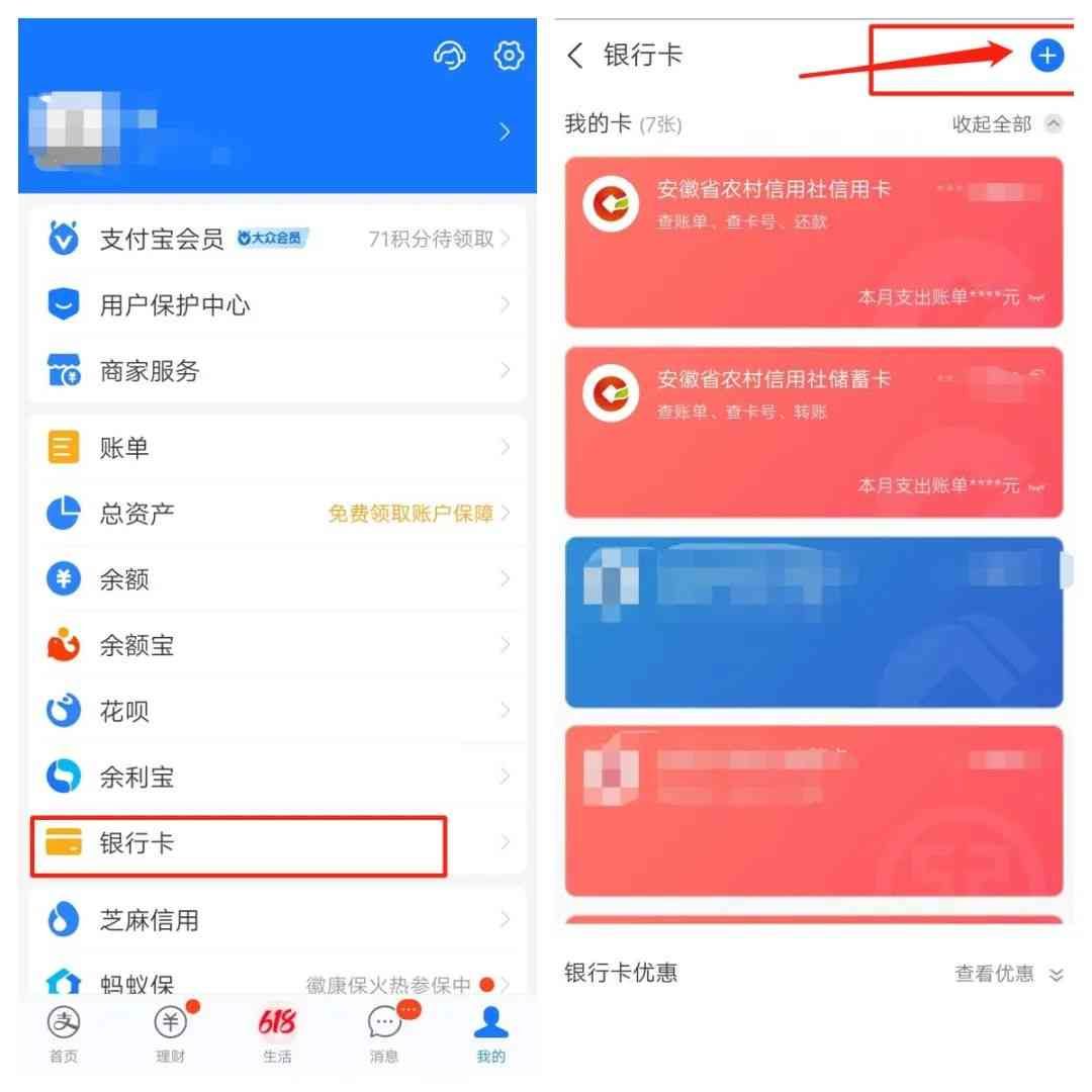 (一)打开支付宝“我的”-“银行卡”界面→点击右上角符号“+”。