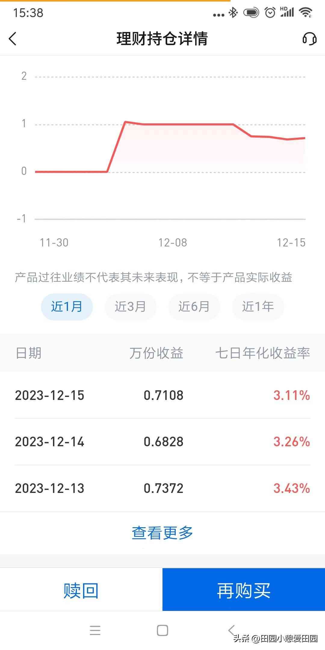 2023-12-12日的年化收益率是3.57%,按此计算日万份收益1*3.57%/365=0.978082192