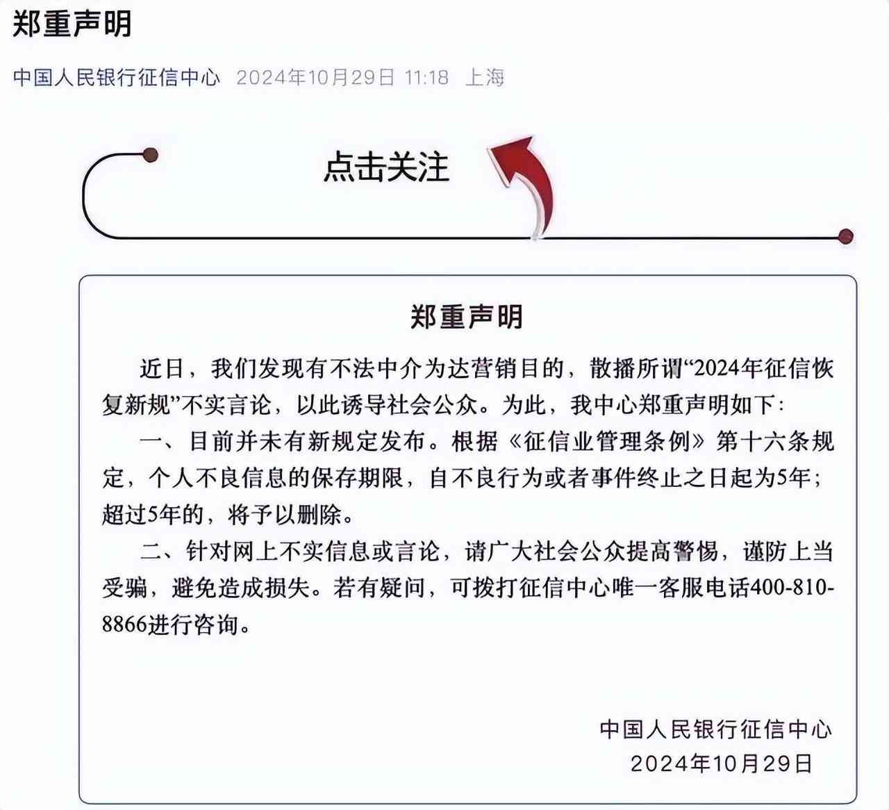 对此消息,10月29日,中国人民银行征信中心发布声明称,近日发现有不法中介为达营销目的,散播所谓“2024 年征信恢复新规”不实言论,以此诱导社会公众。为此,我中心郑重声明如下: