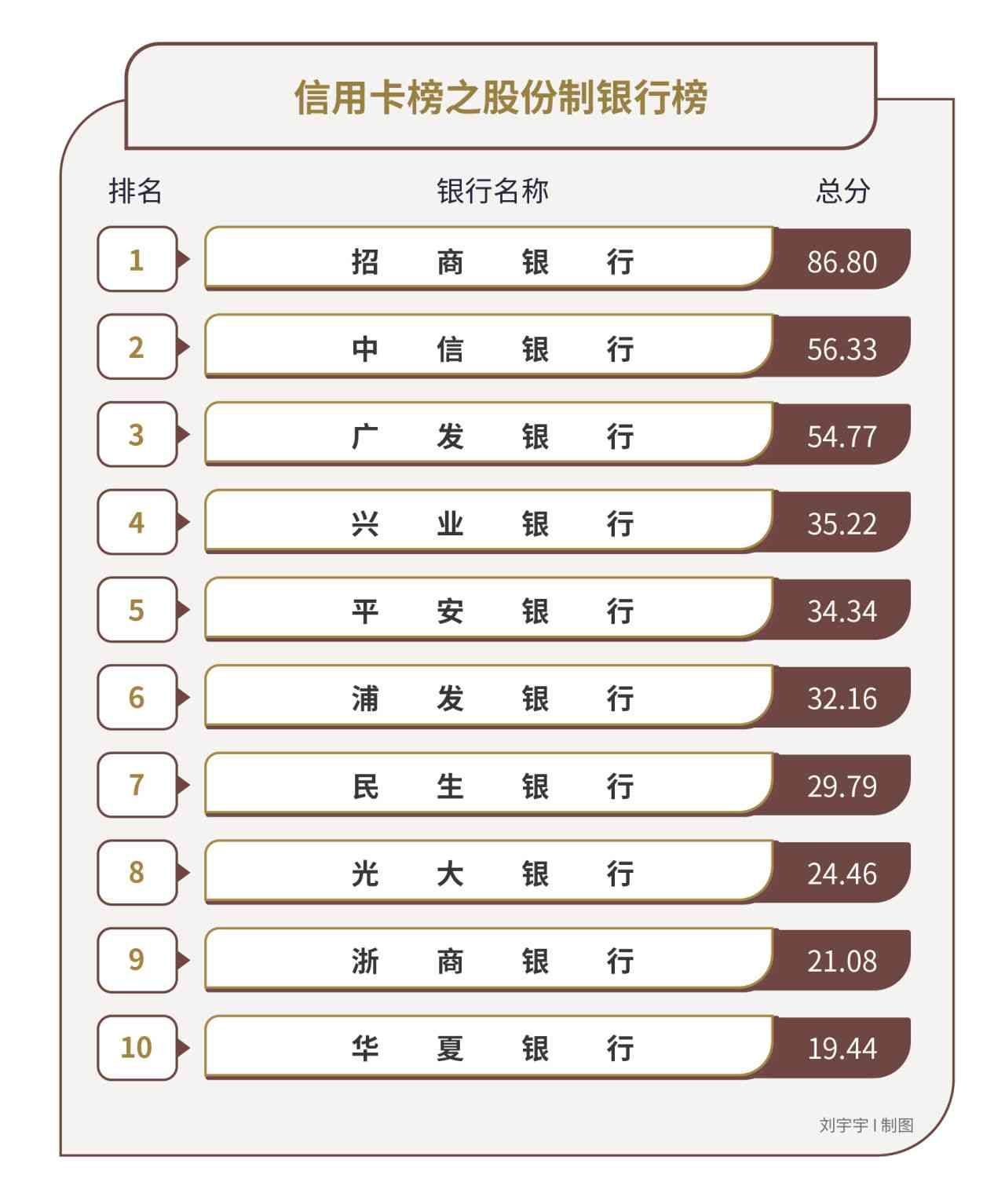 在信用卡领域口碑颇佳的招行以86.8分的绝对优势摘得桂冠,其与第二名建行的分值差距接近20分。