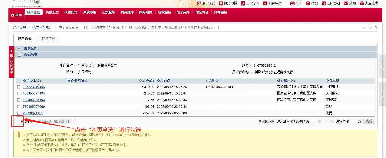 点击“账户管理-电子回单查询”后,在“交易/回单查询”模块输入要查询的起止日期,点击“全选”进行勾选,然后点击“查询”按钮,点击“本页全选”进行勾选后,在点击“生成所选回单下载文件”进入下一个界面,然后点击“返回”按钮,在“回单下载”模块点击“下载”按钮进行下载,点击“保存”按钮,选择文件要保存的位置后,点击“保存”文件就下载完成了。