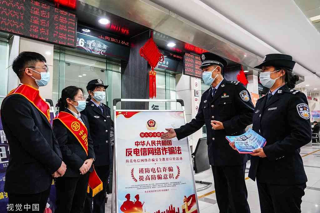 2022年11月30日,江苏南通,派出所民警向银行工作人员宣传反电信网络诈骗法