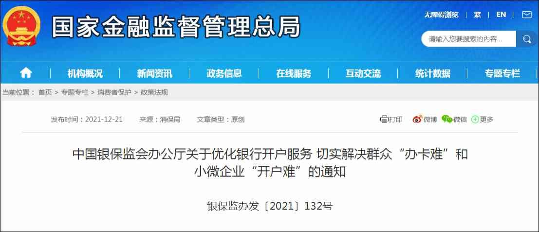 观察者网注意到,2021年12月21日,银保监会发文,提出十项具体措施,着力解决群众“办卡难”和小微企业“开户难”问题,进一步优化银行开户服务。