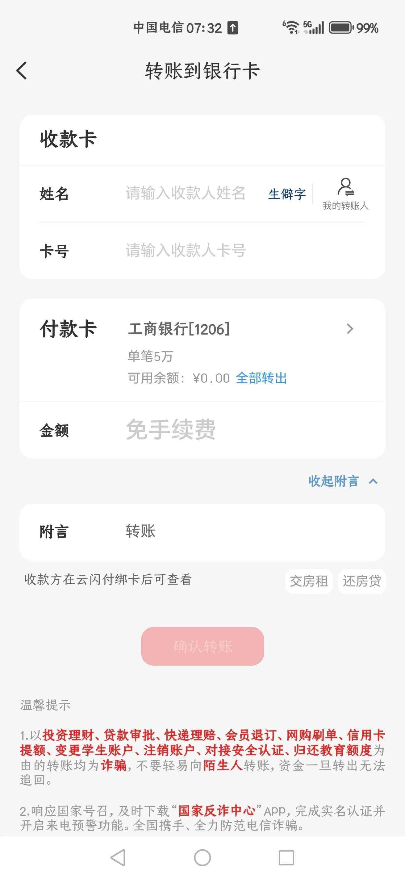昨晚朋友转账7万到我的工商银行账号,想转到支付宝里的余利宝理财,赚个三瓜两枣的利息。结果发现,不知什么时候,我的这张银行卡账号也被限额了!我这个卡可是一类卡,而且房贷也在这张卡扣款,怎么就这么不受待见呢?而且我转给自己名下的支付宝也不行,真把我给气晕了!然后再试一下转账给我的其他银行账号,一样是限额。每天限额5,一个月限额5万,真是太过分了!难道我们老百姓就没有花自己钱的权利吗,然后我们 钱转给自己其他银行账户也是有风险吗!你要防诈骗去抓诈骗分子,一刀切进行限额,完全是Lz的流氓行为!大禹治水,宜疏不宜堵,以为严格限制账户就可以防止诈骗,你就大错特错了!这样下去大家有钱不能用,经济怎么复苏?