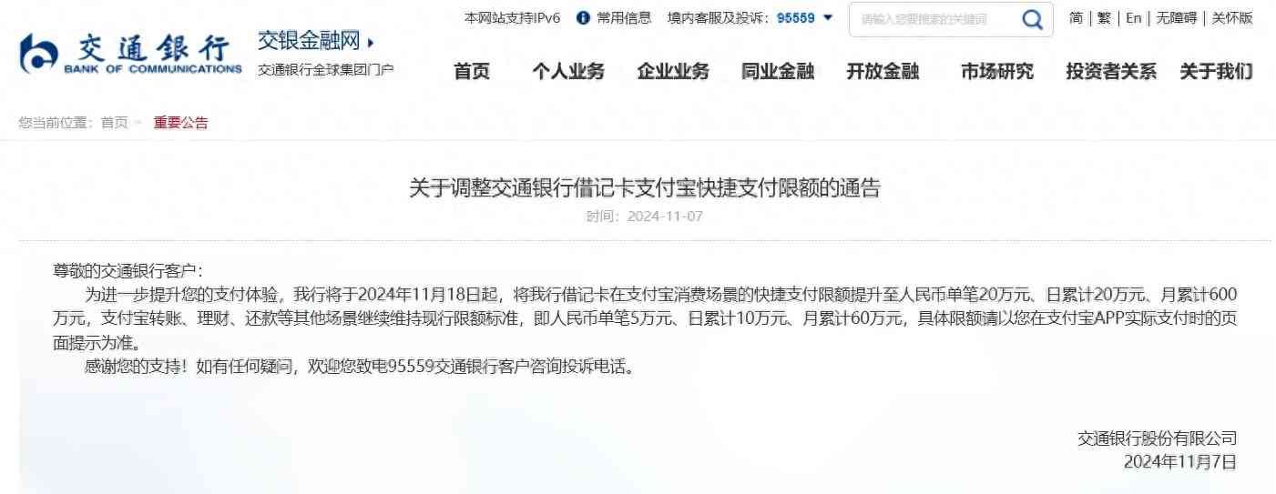 【环球网金融综合报道】11月7日,交通银行发布公告称,将于2024年11月18日起,将我行借记卡在支付宝消费场景的快捷支付限额提升至人民币单笔20万元、日累计20万元、月累计6万元,支付宝转账、理财、还款等其他场景继续维持现行限额标准,即人民币单笔5万元、日累计10万元、月累计60万元,具体限额请以您在支付宝APP实际支付时的页面提示为准。