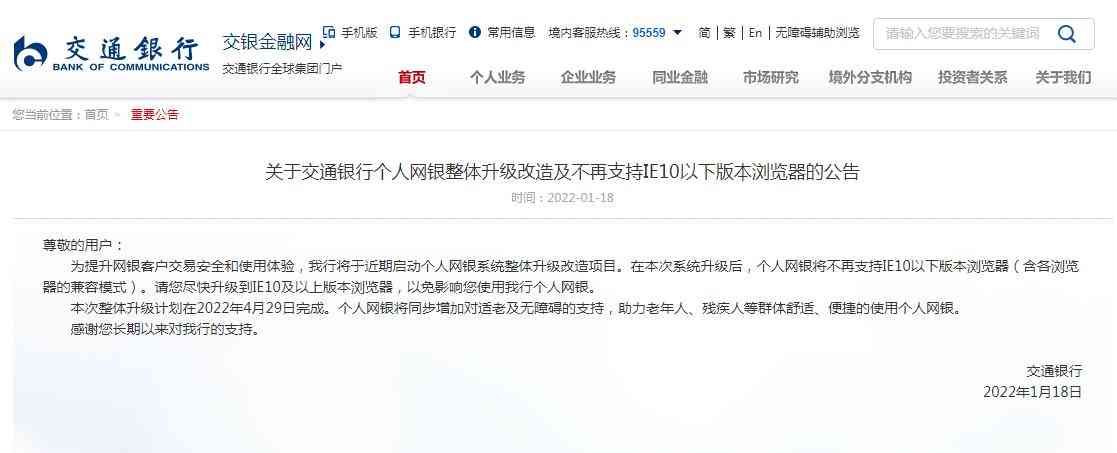 交通银行发布关于个人网银整体升级改造及不再支持IE10以下版本浏览器的公告