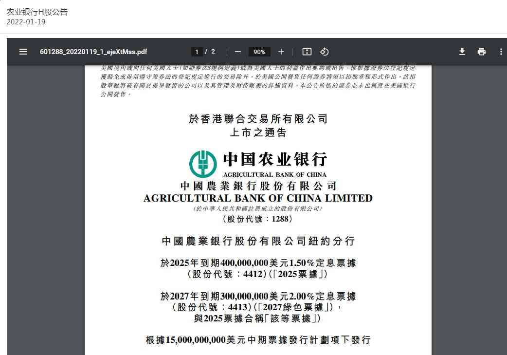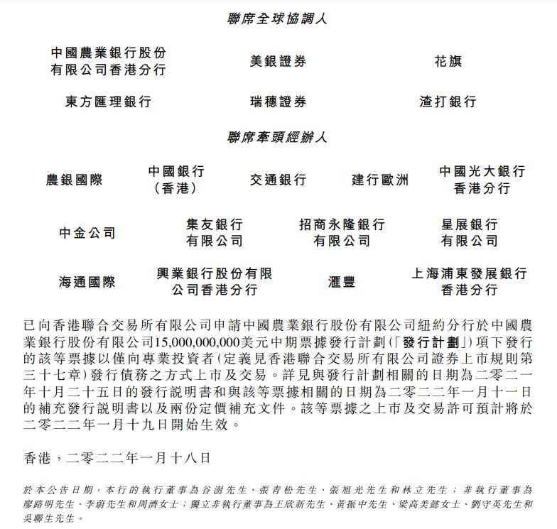 1月18日,中国农业银行发布公告称,已向香港联合交易所有限公司申请中国农业银行股份有限公司纽约分行于中国农业银行股份有限公司15,,,美元中期票据发行计划。