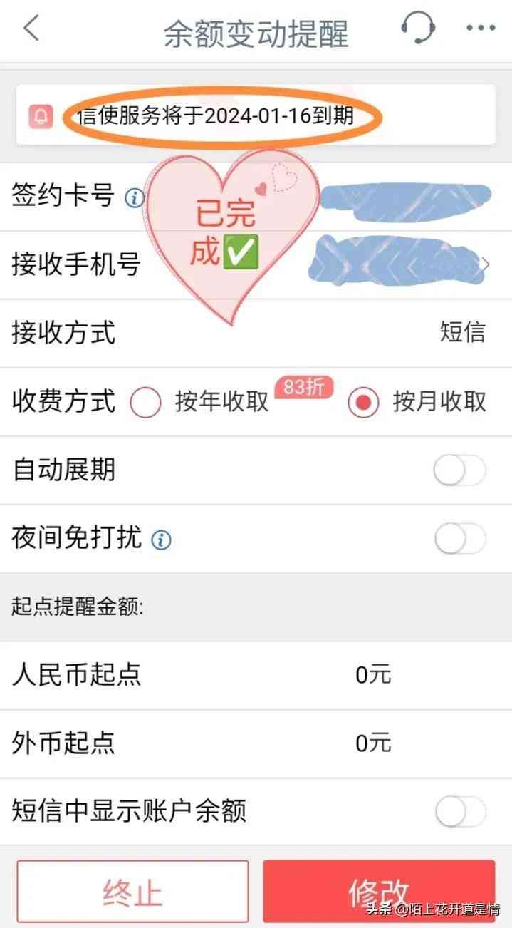 第二步:选择你已使用的短信服务银行卡,然后选择终止。终止可以选择立即终止、到期终止。到期终止,是指下一个扣费日前还可以收到短信提醒。