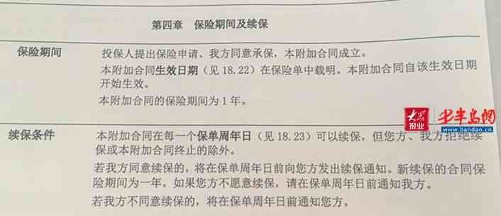 10月22日,张先生翻箱倒柜找出来了当时购买这份保险之后收到的保险合同,记者看到,合同的续保条件是,“本合同在每一个保单周年日可以续保,但您方、我方拒绝续保或本合同终止的除外。若我方同意续保的,将在保单周年日前向您方发出续保通知。新续保的合同保险期间为一年。如果您方不愿意续保,请在保单周年日前通知我方。若我方不同意续保的,将在保单周年日前通知您方。”