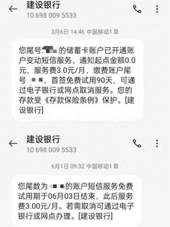 建设银行在扣除短信服务费时没有任何短信提醒。调查样本显示,体验员在建设银行开通“账户变动通知”业务,服务费3元/月,通知起点金额0元,免费试用90天。短信服务免费试用期结束前,建设银行短信告知了试用期结束时间即将收取服务费3元/月。其后体验员建设银行App中每月确实显示有3元的扣费交易,但是均未收到相关短信通知,在此期间其他交易扣费均能收到银行短信提醒。经致电建设银行客服人员,确认该项收费没有短信通知。