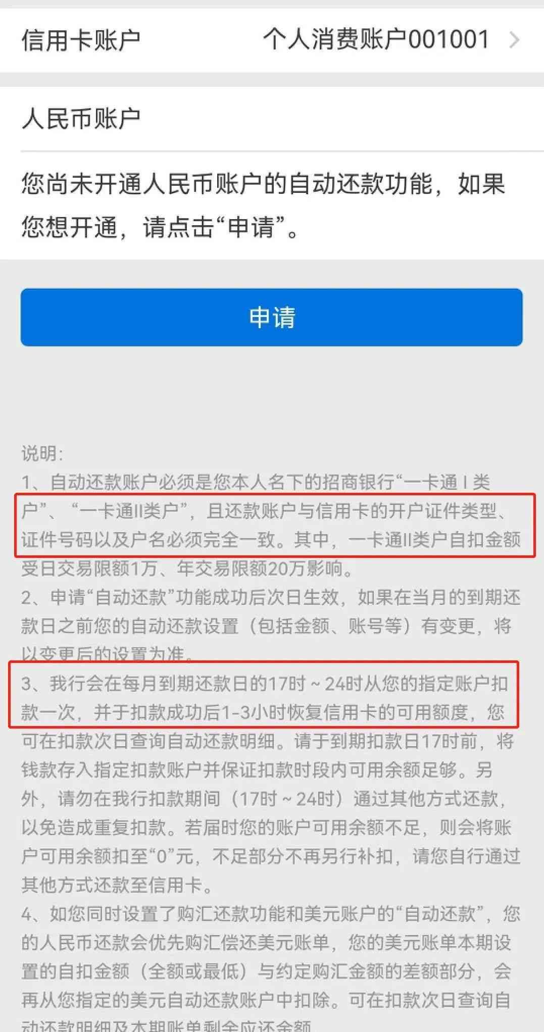 消费实验室尝试在招商银行APP开通自动扣款功能,发现招行信用卡的自动扣款功能确实需要手动申请开通,且条款里明确提到了还款卡有类别限制,也规定了自动还款日期。