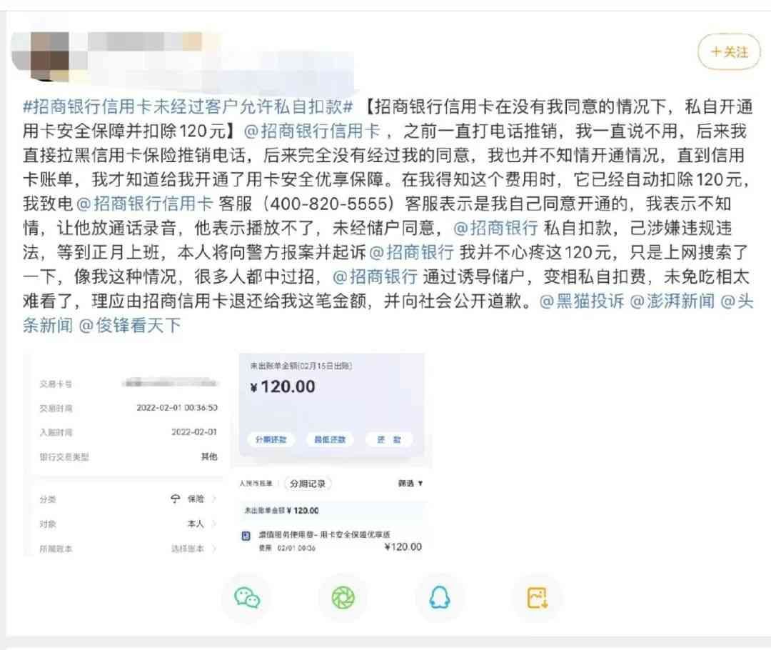 微博博主“刘**同学”称,“招商银行信用卡在没有我同意的情况下,私自开通‘用卡安全保障’并扣除120元,在没有经过我的同意的情况下,给我开通了增值服务,在我得知这个消息时,他已经自动扣除了120元。”
