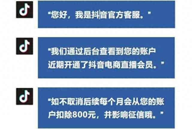 骗子冒充抖音客服,声称受害人开通了“抖音电商直播会员”服务,如不关闭将连续一年每月自动扣费五六百元,扣费失败甚至会影响个人征信。