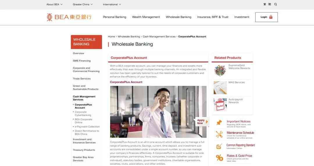 香港东亚银行是香港提供各种银行服务,这些服务与大型全球银行的企业银行账户所提供的服务类似。这些服务包括个人银行业务、批发银行业务、财富管理、投资、公司及商业融资、中小企业融资等。