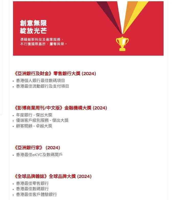 在2024年,香港东亚银行获得了显著的奖项,包括《亚洲银行及财金》杂志颁发的"香港个人银行最佳数码项目"和"香港最佳流动银行及支付项目"、《彭博商业周刊/中文版》的"年度银行 - 杰出大奖"、"优端客户级别服务 - 杰出大奖"和"顾客关顾 - 卓越大奖"、《亚洲银行家》的"香港最佳eKYC及数码开户",以及《全球品牌杂志》的"香港最佳零售银行"、"香港最佳数码银行"和"香港最佳客户体验银行"等多项大奖。