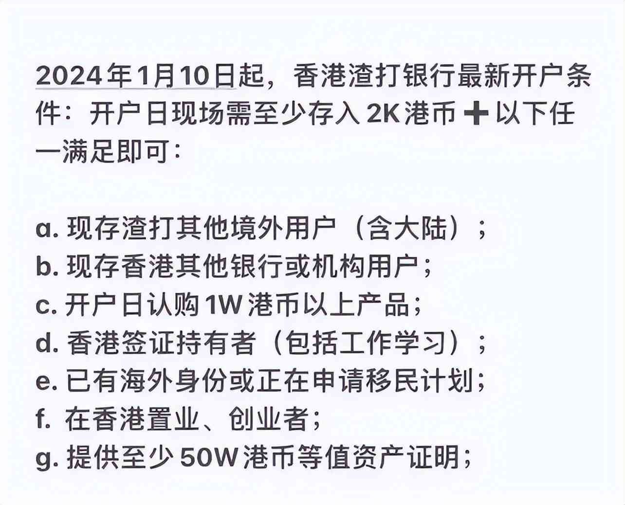 2024年1月10日起,香港渣打银行最新开户条件:开户日现场需至少存入2K港币十以下任一满足即可:
