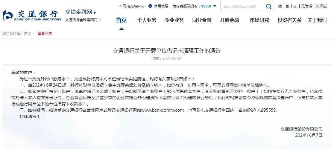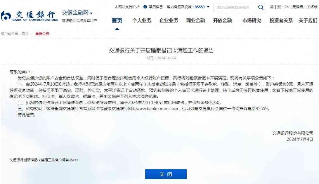 7月4日,交通银行发布关于开展睡眠借记卡清理工作的公告。
