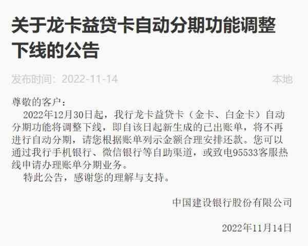 日前,建设银行发布公告,自2022年12月30日起,该行龙卡益贷卡(金卡、白金卡)自动分期功能将调整下线,即自该日起新生成的已出账单,将不再进行自动分期,客户需根据账单列示金额合理安排还款。