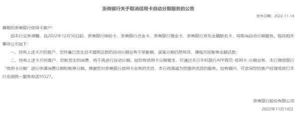 浙商银行近日发布了类似公告。公告显示,自2022年12月30日起,浙商银行缤纷卡、浙商银行点金卡、浙商银行增金卡、浙商银行京东金融联名卡,将取消自动分期服务。