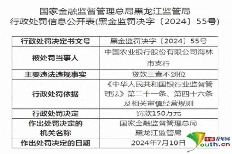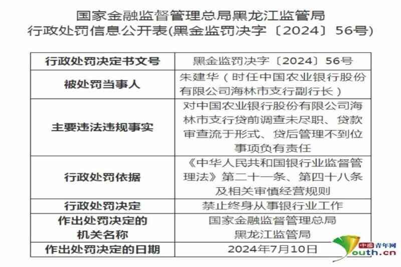中国青年网讯近日,国家金融监管总局黑龙江监管局发布行政处罚信息,农业银行海林市支行因贷款三查不到位被罚款150万元,时任农业银行海林市支行副行长朱建华被禁止终身从事银行业工作。农业银行牡丹江分行因贷款审核审批不审慎被罚款50万元。