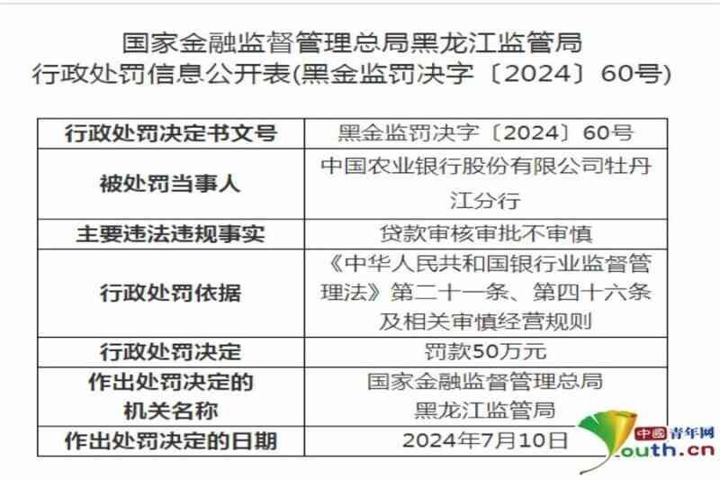 此外,处罚信息还显示,农业银行股份有限公司牡丹江分行存在贷款审核审批不审慎的违法违规事实,被国家金融监督管理总局黑龙江监管局罚款50万元。时任农业银行股份有限公司牡丹江分行独立审批人郭文海、黄勇、宁铁光等三人,对农业银行股份有限公司牡丹江分行贷款审核审批不审慎事项负有责任,分别被警告。