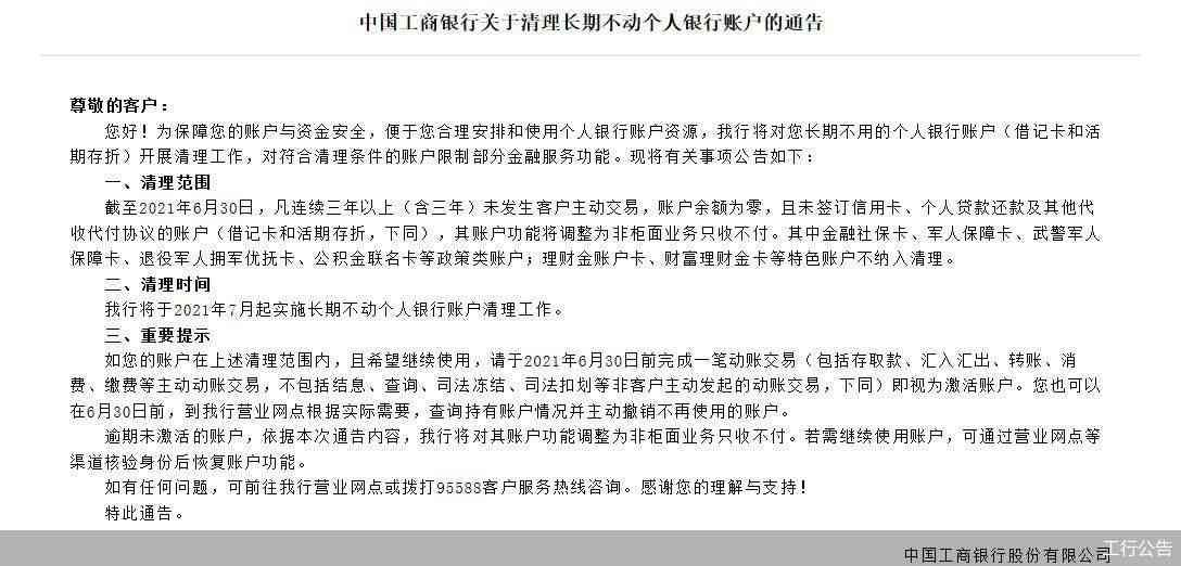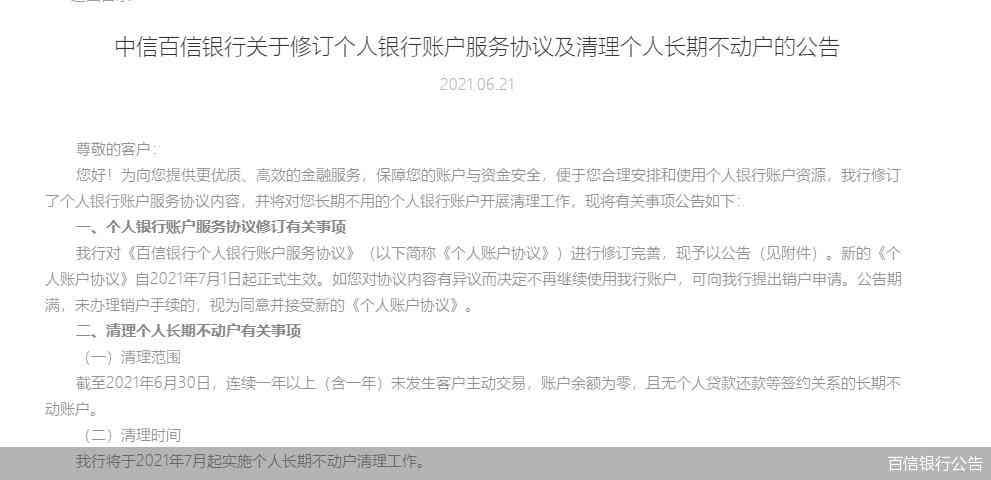 根据工商银行日前公告,该行将于2021年7月起对用户长期不用的个人银行账户(借记卡和活期存折)开展清理工作,对符合清理条件的账户限制部分金融服务功能。百信银行同样在近日发布公告称,该行将于2021年7月起实施个人长期不动户清理工作。
