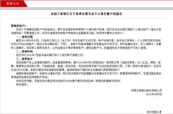 工行将于 2021 年 7 月起实施长期不动个人银行账户清理工作。
