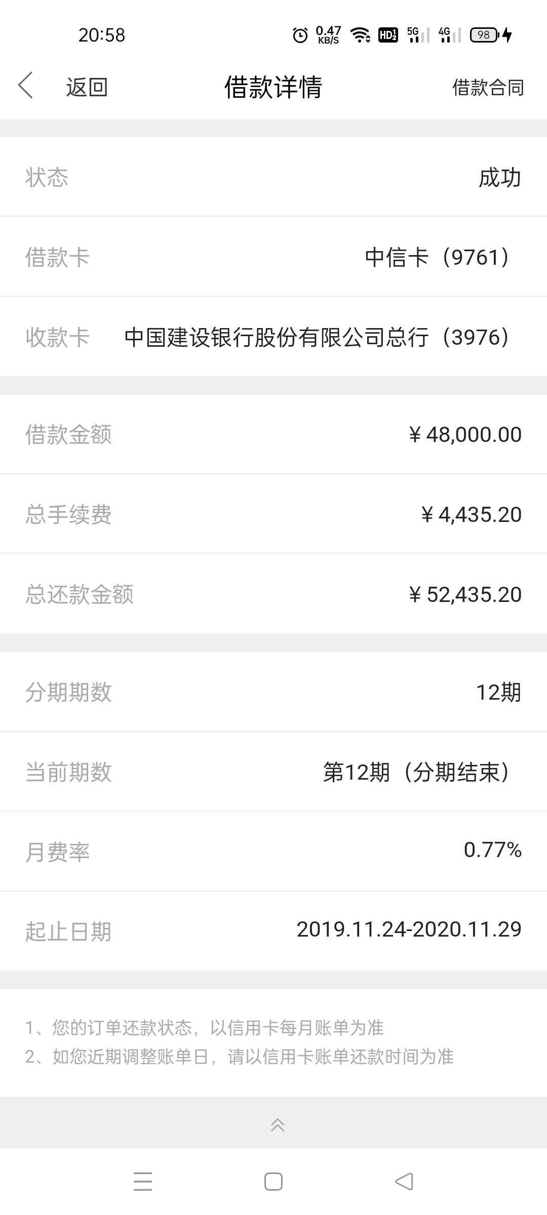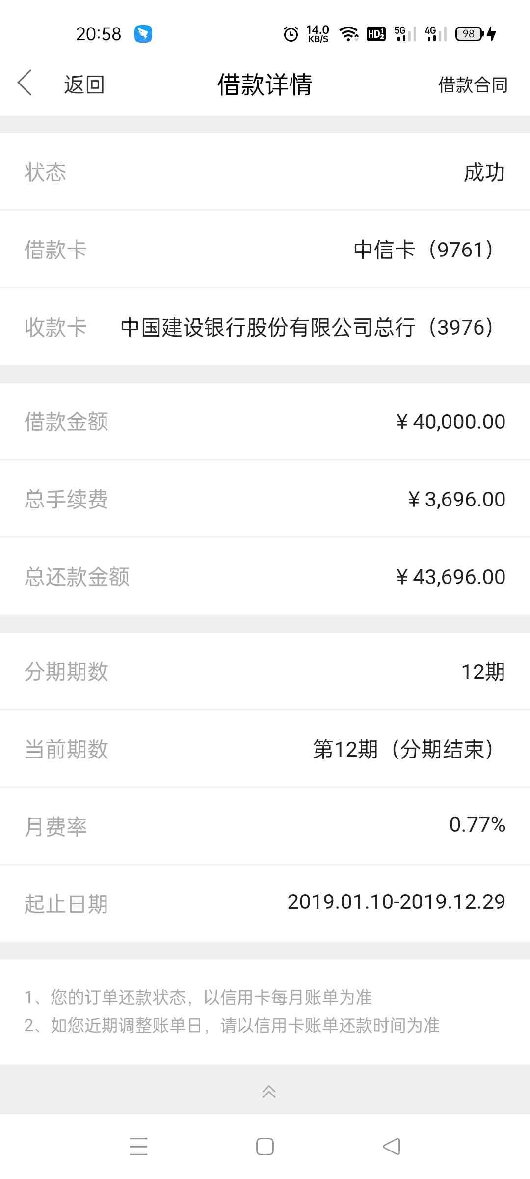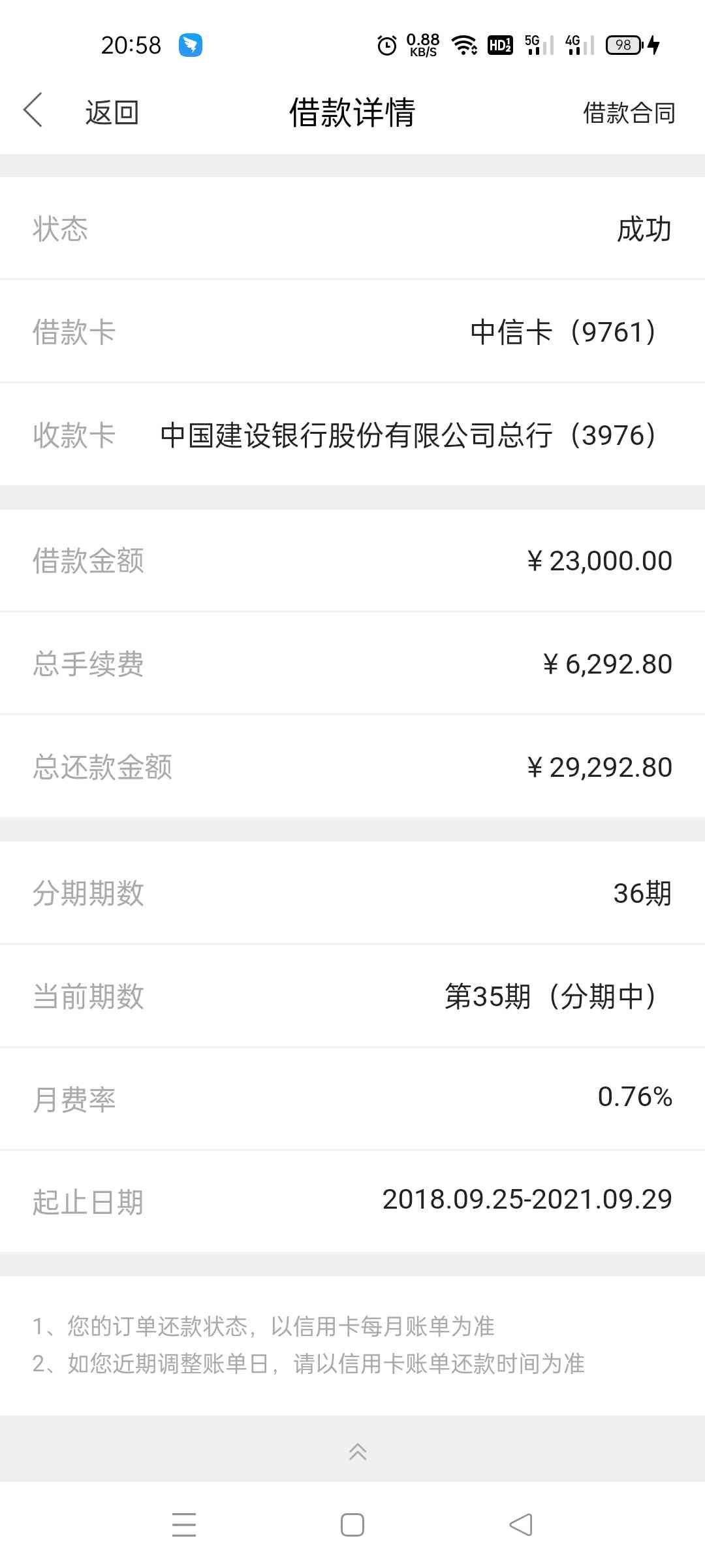 中信是我办理分期最多的一张信用卡,原因是他们给我提供了几笔信用卡贷款,但是他们的贷款一直给我推荐的是36期,也就是3年还清,刚开始因为我确实是需要用钱,而且他们也说了3年期的手续费很低的,有什么优惠和折扣,也可以提前还款,没有违约金,但是等到最终还款下来手续费是真的高呀,如下图!