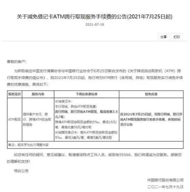 中国银行在其官网发布公告称:自2021年7月25日起,对跨行同城、跨行异地ATM取现服务暂行免收手续费,恢复时间另行公告。