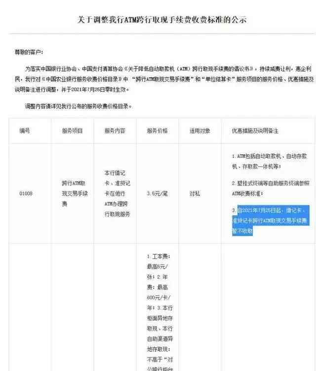 农业银行发布公告称:自2021年7月25日起,借记卡、准贷记卡跨行ATM取现交易手续费暂不收取。