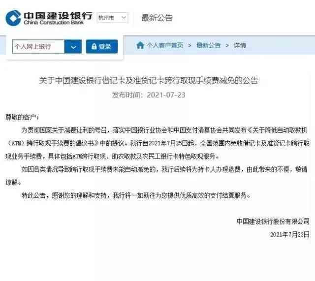 建设银行发布公告表示,自2021年7月25日起,全国范围内免收借记卡及准贷记卡跨行取现业务手续费,具体包括ATM跨行取现、助农取款及农民工银行卡特色取现服务。