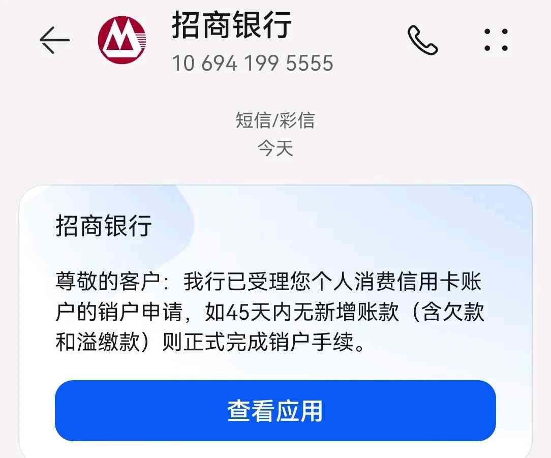 【招商银行】尊敬的客户:我行已受理您个人消费信用卡账户的销户申请,如45天内无新增账款(含欠款和溢缴款)则正式完成销户手续。
