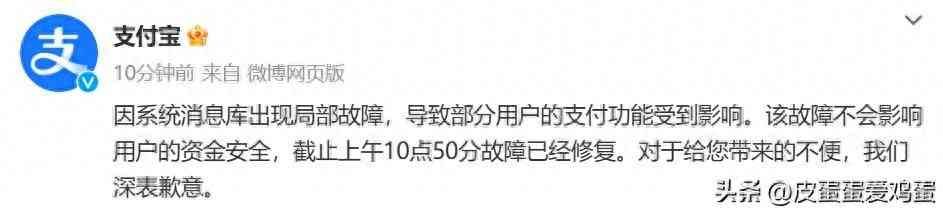支付宝官方称因系统消息库出现局部故障,导致部分用户的支付功能受到影响。该故障不会影响用户的资金安全,截止上午 10 点 50 分故障已经修复。据相关数据显示,此次故障影响范围广泛,涉及众多用户的支付交易。支付宝的迅速回应,旨在缓解用户的焦虑情绪,同时也表明了其对问题的重视程度和解决问题的决心。