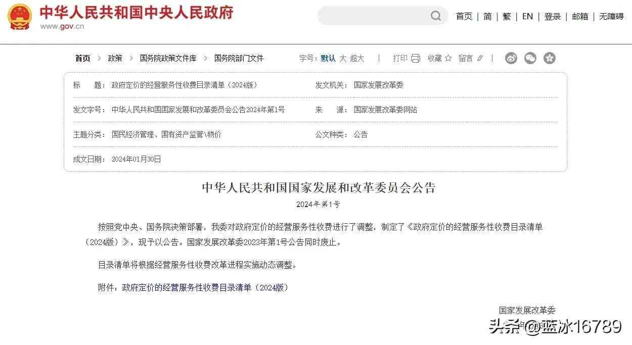 近日,按照党中央、国务院决策部署,国家发改委对政府定价的经营服务性收费进行了调整,制定了《政府定价的经营服务性收费目录清单(2024版)》,现予以公告。国家发展改革委2023年第1号公告同时废止。