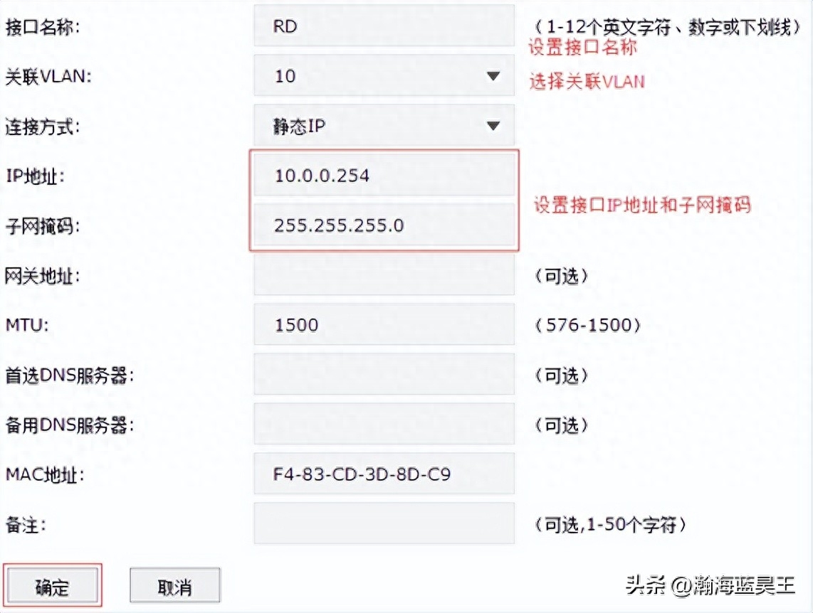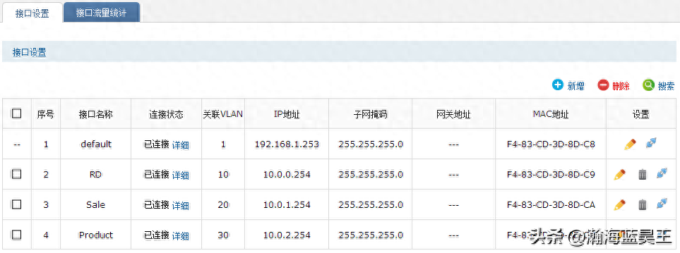 点击“网络设置>接口设置”,新增已设置好的三个VLAN的接口地址,设置如下图: