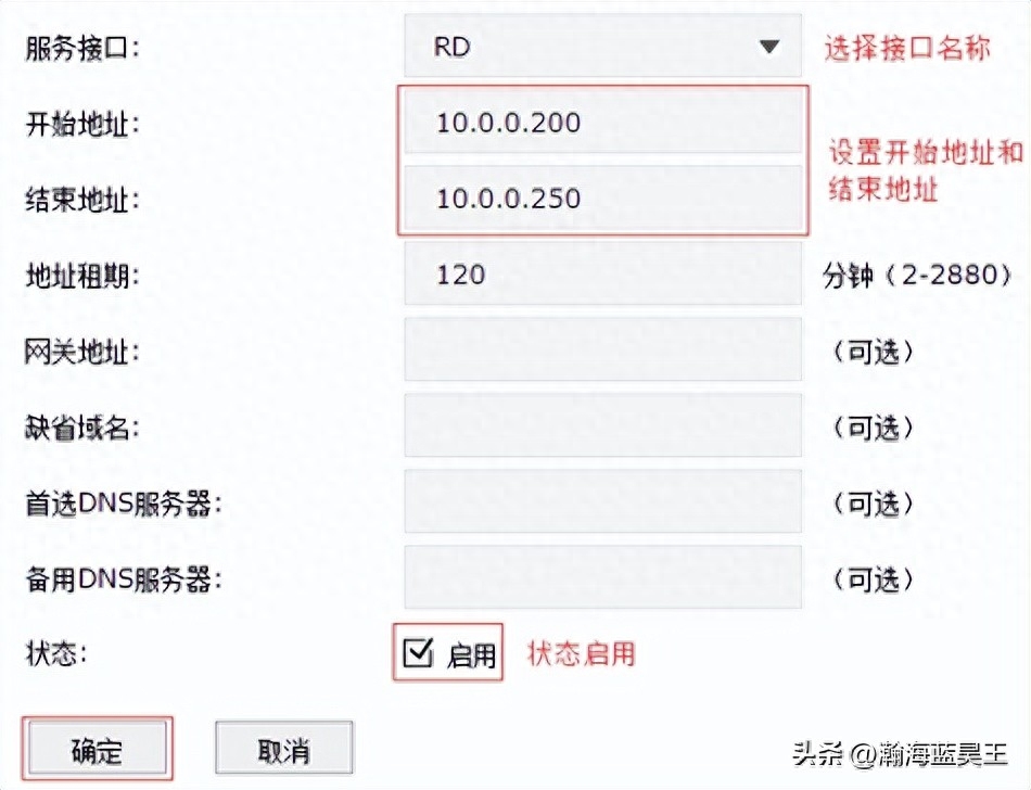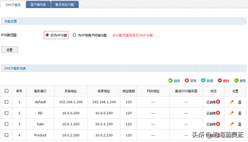 点击“网络设置服务”,设置AC给各个VLAN中的AP分配IP地址的DHCP服务,分别新增与各个VLAN接口同网段的地址池,设置如下图: