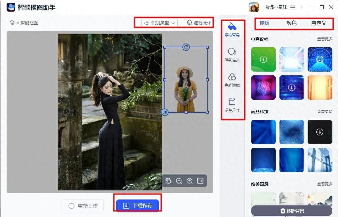图片上传后系统自动抠图,抠出来的图像可以更换背景、阴影描边、色彩滤镜、调整尺寸,最后点击【下载保存】即可。