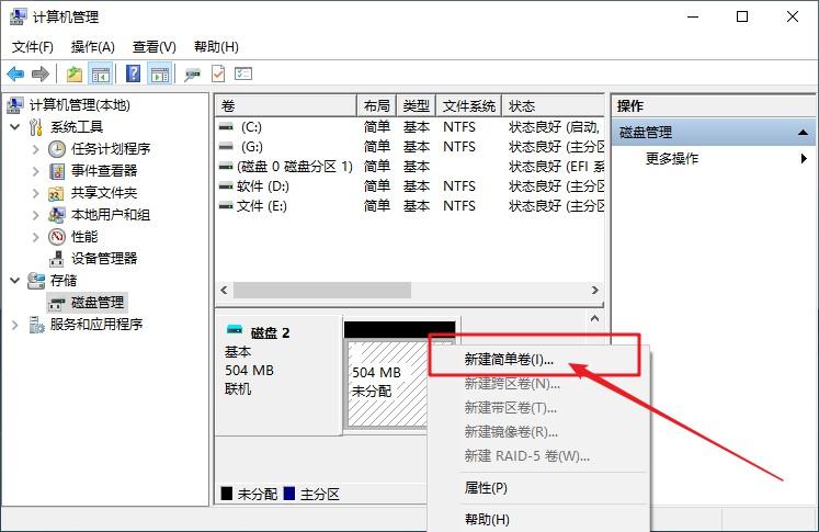打开 Server Manager -> Tools -> Computer Management左侧导航栏选择 Storage -> Disk Management菜单 Action -> Create VHD选择目标 VHD 文件位置选择硬盘大小,如10G选择 VHD 格式。用户可以选择 VHD 或 VHDX,VHD 最大支持 2T 磁盘,2T以上空间请选择 VHDX。选择 VHD 类型,固定大小或动态扩展均可,推荐 Dynamic expandingVHD文件创建后,会自动挂载到系统,若没有自动挂载,可通过菜单 Action -> Attach VHD 选择 VHD 文件挂载。