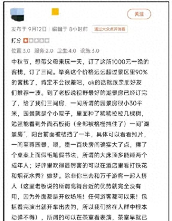 根据姚女士的抱怨,她被安排入房间,但该房间并未如预期,让她感到非常失望。尽管住宿价格高昂,但视野较差,且附带景观被屋顶和建筑物遮挡,无法看到美景。与此同时,酒店所宣传的打铁花和烟花秀观赏点未能兑现,现场人满为患,无法找到合适的位置观赏。酒店提供的茶室观赏区也异常拥挤。最令人沮丧的是,住宿并未包含早餐,需要前去外部寻找食物,价格昂贵。总之,姚女士认为所提供的服务不符合价格,而住宿餐饮价格不透明。她在社交媒体上发表差评,表达了自己的不满。