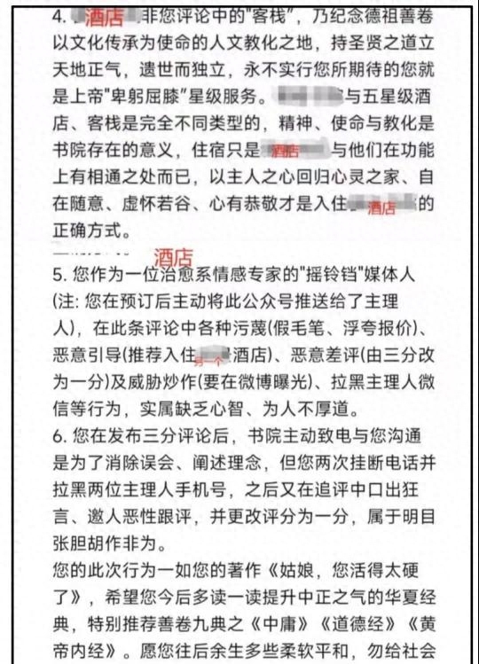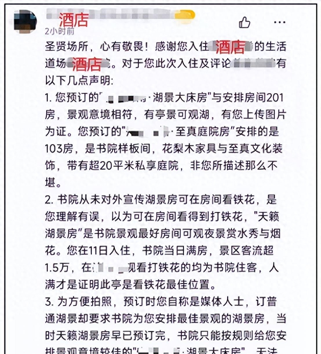 住宿方对此作出反应,对姚女士的抱怨进行了详细的回应。他们辩称,住宿内的装饰和设施与姚女士所描述的不同,视野并不狭窄。住宿并未公开承诺观赏活动,且人多是因为景区客流量增加。住宿方声称姚女士要求特别待遇,但付出的是普通房间的价格,这是无法满足的。住宿方表示他们不是普通酒店,而是一个传承文化的书院,不提供商业化服务。住宿方的回应中也涉及了侵犯隐私和恶意引导的言论,此举引发了姚女士的不满。