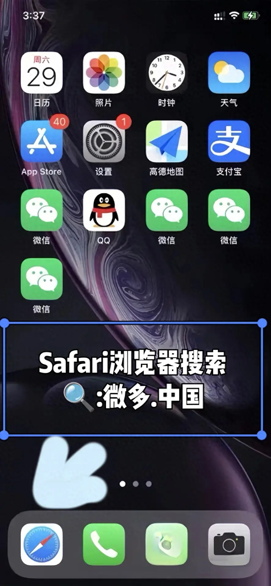1.打开你的手机自带的Safari浏览器,在搜索框输入【微多.中国】,然后点击安装。稍等片刻,你会发现桌面多了一个无法打开的微信图标。别担心,我们继续往下看!
