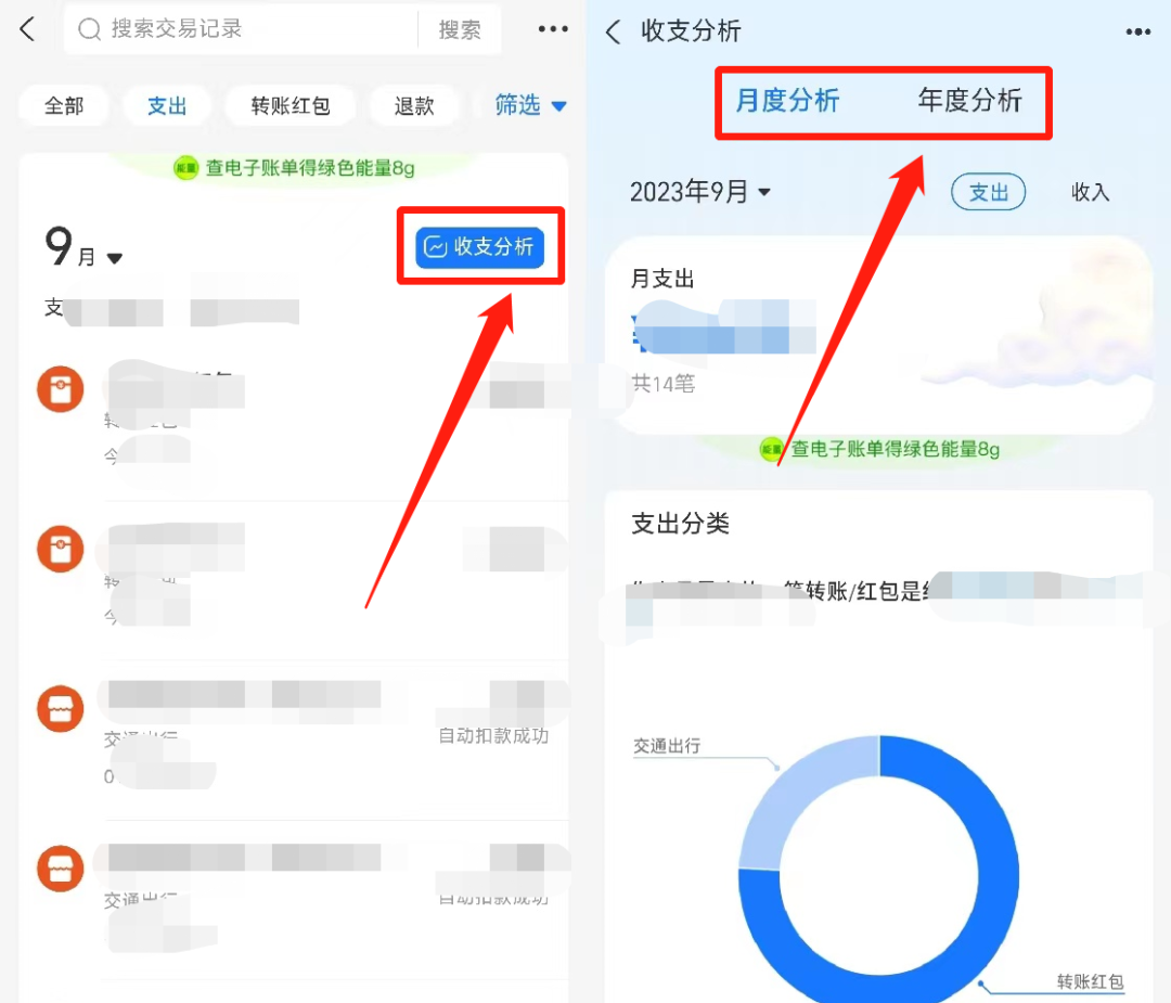 7、通过点击交易记录页面的“收支分析”,即可进行月度分析、年度分析。