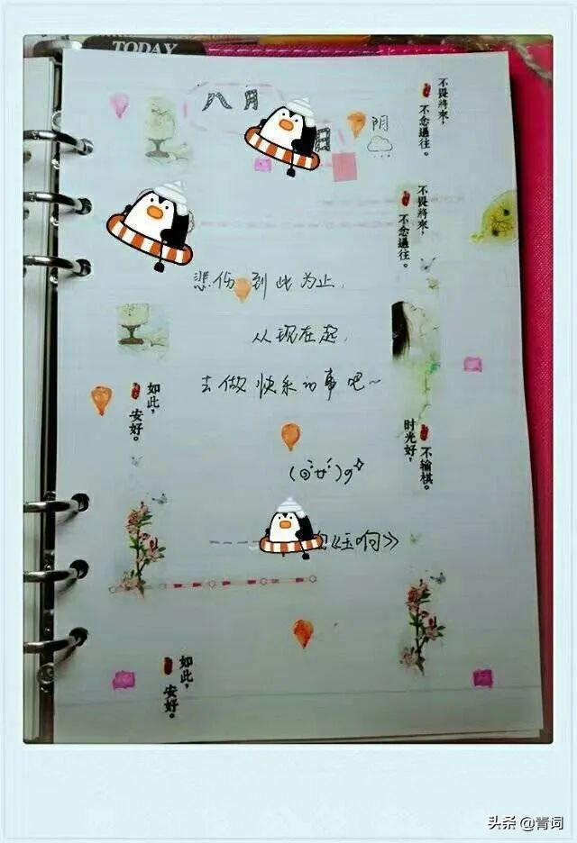 所有开心的不开心的全都写到本子里,去了哪些地方做了什么事遇见了谁都一一记录下来,偶尔吐槽下生活,感慨下人生,把喜欢的电影台词摘抄下来…